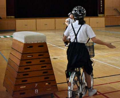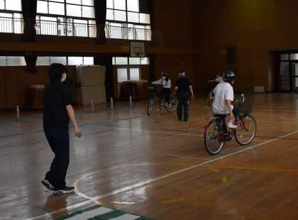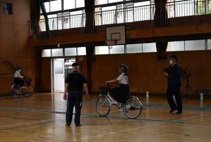 地域活動協議会の方が見守る中、淀川警察署のみなさんの指導のもと、子どもたちはみんな真剣に安全走行やS字走行に挑んでいます。