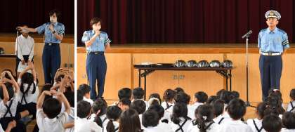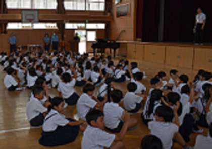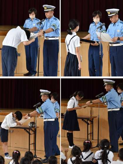 終業式では、校長先生のお話と、夏休みの安全な生活についてのお話のあと、淀川警察の方から、自転車大会の表彰と交通安全に関するクイズをしていただきました。