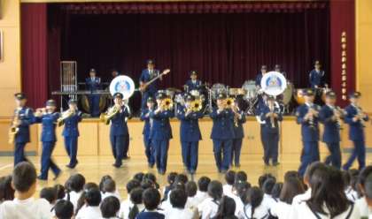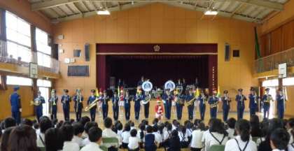 演奏会の第二部は、さまざまに隊形移動を行う「ドリル演奏」を見せていただきました。子どもたちは、きびきびとした動きと、いろいろに変わる隊形に目を見張っていました。6年生はギャラリーから見ていましたが、とても真剣なまなざしでした。