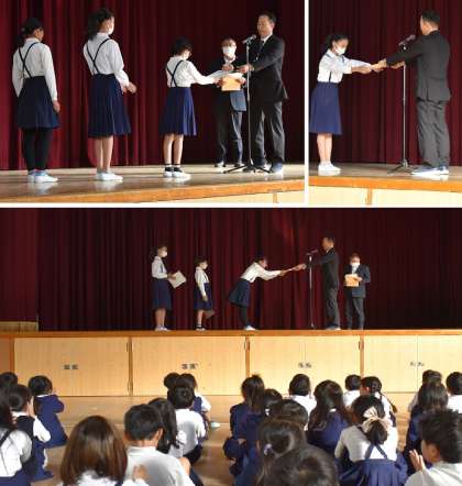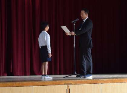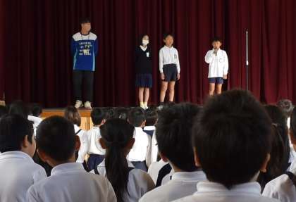 全校朝会で2つの表彰がありました。「大阪府学生科学賞」と「大阪市小学校児童絵画・版画展」の表彰です。