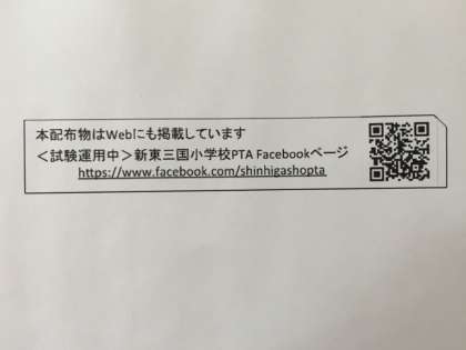 本校のPTAからの配布物にはQRコードがついています。携帯電話やスマートフォンからQRコードを読み取っていただきますと、PTAの取り組みや本校の行事を確認することができます。土曜日の校庭開放の予定もご覧いただけます。また、フェイスブックの登録をしていただなくてもご覧いただけます。ぜひご活用ください。