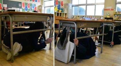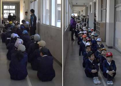 ベルの合図で、子どもたちはまず机の下に隠れて自分の身を守った後、揺れがおさまったと想定して頭を守りながら運動場に避難しました。