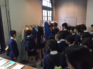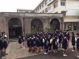 新しい校舎の向こうに、当時のままの校舎の一部が残され、資料館となっています。入り口の碑の前で平和のつどいを行い、平和の誓いをしました。全校児童で折った千羽鶴は、資料館の中で供えました。