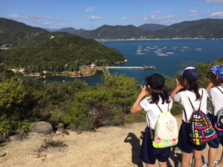 階段の途中で振り返ると、宿舎と芝生広場が眼下に。485段の階段を登り終えると、瀬戸内海を望む絶景ポイント。