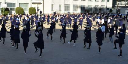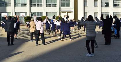 今朝は児童集会の前に「かけ足ダンス」をしました。地域の方にも参加していただき、一緒に体を動かしました。