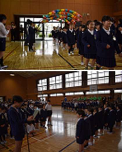 ピカピカの1年生が、2年生から6年生までのお兄さん・お姉さんたち全員と、初めてのご対面をしました。興味津々の1年生は目を輝かせながら、花のアーチをくぐって入場してきました。