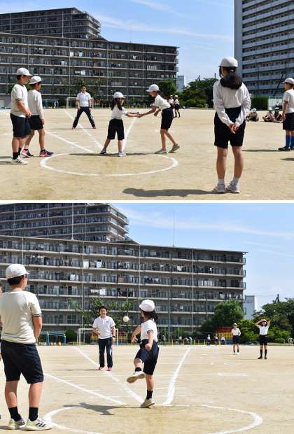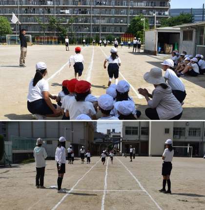 1年生にとっては、はじめてのスポーツテスト。6年生が「50m走」と「ソフトボール投げ」のお手伝いをしました。「まっすぐに走りや。」とゴールを指さして説明したり、ボールの投げ方を教えたり。6年生がお手本でボールを投げたときには、1年生の子どもたちからは「すごい!」という声があがっていました。