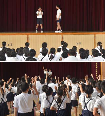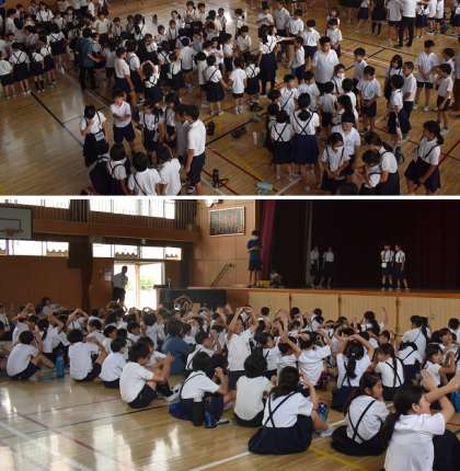 全校児童が講堂に集まり、「漫才」や「王様じゃんけん」、「船長さんの命令ゲーム」に「学校や各学年に関するクイズ」など、バラエティに富んだプログラムを楽しみました。