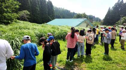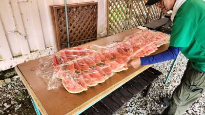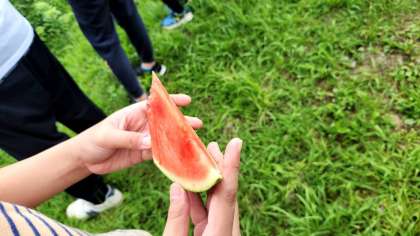 高原の散策を終えてのおやつ、「すいかタイム」です。山の中で食べるすいかは、いつもより、おいしく感じました。