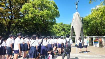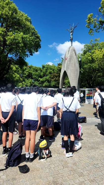 原爆の子の像の前で、「平和の誓い」をみんなで伝えました。その後、原爆死没者への追悼と世界の平和を祈り、黙祷を捧げました。