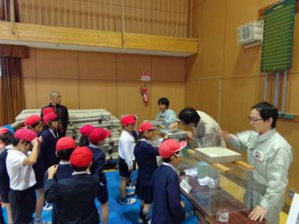 「道路の吸水実験」コーナーでは、実際に道路に使われている3種類のブロックを使い、上から水をかけて、そのしみこみ方を観察しました。「雨が降っても、水たまりができにくい道路」にすることも「道路のバリアフリー」の一つであることを学びました。