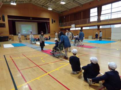 「車いす体験」コーナーでは、実際に車いすに乗って、街にあるいろいろな段差や坂になっているところを体験しました。ちょっとした段差を上れないことや、道路にあるちょっとした坂が車いすの操作を邪魔してしまうことを知りました。