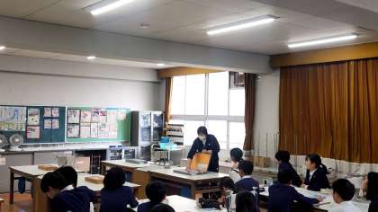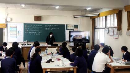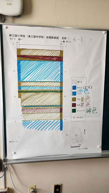 地層の成り立ちについて学習しています。新東三国小学校の地層についても、ボーリング調査結果をもとに学びました。