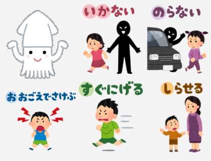 「いかのおすし」はよく聞く合言葉で「ついていかない」「さそわれてものらない」「おおごえでさけぶ」「すぐにげる」「おとなにしらせる」の5か条のことです。