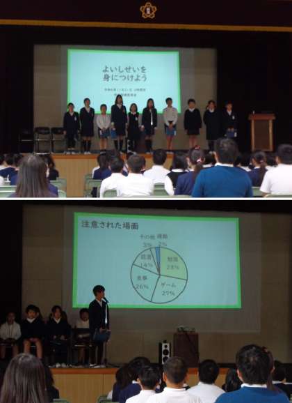 保健委員会からは、アンケート調査の結果をグラフなどで示しながら、姿勢をよく保つことの大切さなどについて発表を行いました。姿勢のちがいによる体への負担を確かめる実験や、「みんなで姿勢体操」のコーナーも!