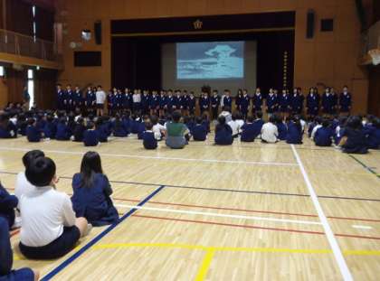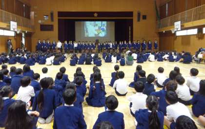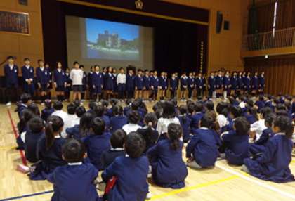 今朝の児童集会で、6年生が全校児童に向け、修学旅行を通して学んだことの報告をしました。