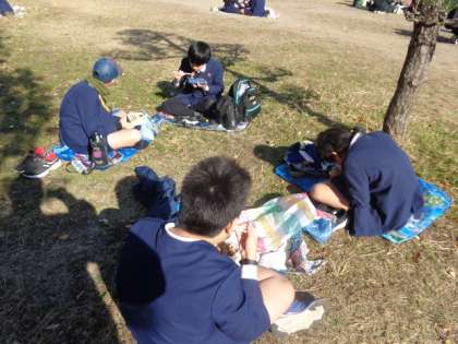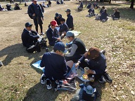 昼食は大阪城公園の広場でお弁当を食べました。家庭科の学習の一環として自分たちでお弁当を作りました。みんな朝早くから頑張って作ったお弁当を、おいしそうに食べていました。
