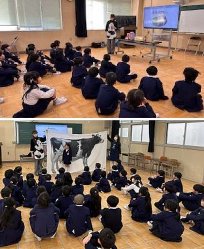 まずは多目的室での食育出前授業です。「牛乳の大切さを知ろう!」をテーマに、給食で毎日飲んでいる牛乳の栄養や、牛乳ができるまでを学習しました。実物大のホルスタインの絵を見て、子どもたちはその大きさにびっくり。目を丸くしていました。