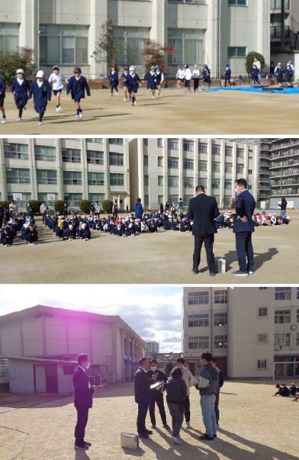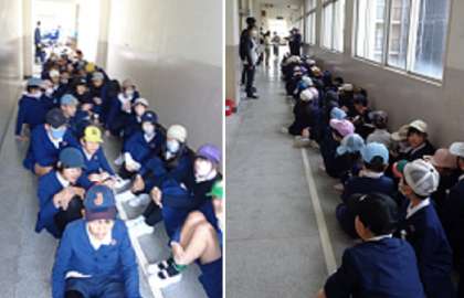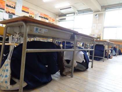 子どもたちはまず机の下に隠れて自分の身を守った後、揺れがおさまったと想定して頭を守りながら運動場に避難しました。
