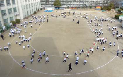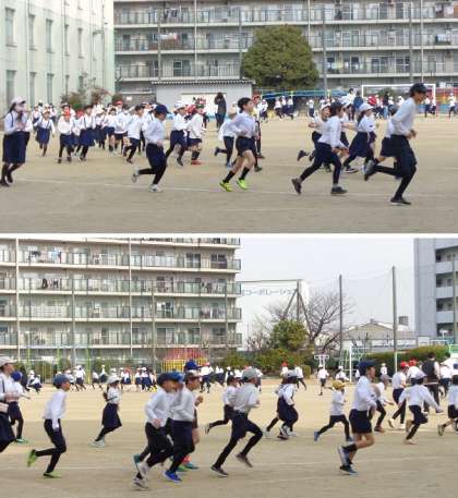 2時間目終了後、一斉に運動場へ出てきた子どもたちは、曲に合わせてゆっくりと歩いたあと、自分のペースで走ります。