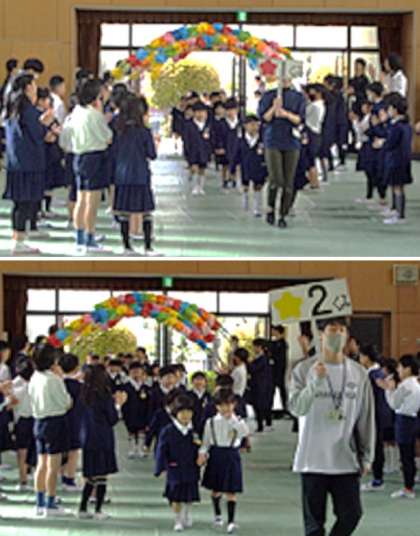 ピカピカの1年生が、2年生から6年生までのお兄さん・お姉さんたち全員と、初めてのご対面をしました。興味津々の1年生は目を輝かせながら、花のアーチをくぐって入場してきました。