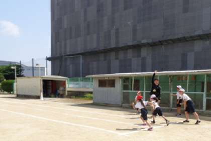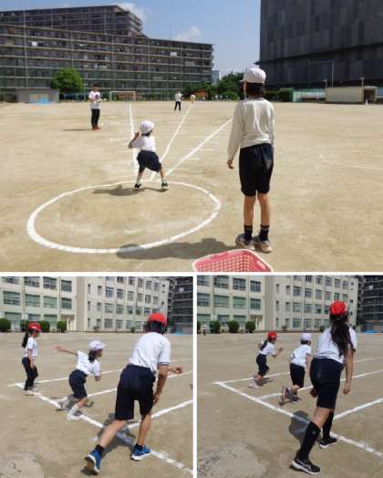 1年生にとっては、はじめてのスポーツテスト。6年生が「50m走」と「ソフトボール投げ」のお手伝いをしました。「まっすぐに走りや。」とゴールを指さして説明したり、ボールの投げ方を教えたり…。6年生がお手本でボールを投げたときには、1年生の子どもたちから「すごい!」という声があがっていました。