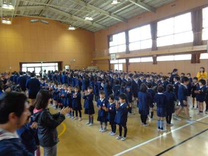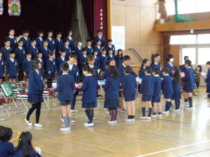 最後に、6年生から各学年に、「学校をきれいにしてください。」と、家庭科の時間にぬった「ぞうきん」が贈られました。担任の先生に聞くと、6年生の子どもたちは、使いやすいようにと、何度も縫ったり、細かく縫ったり工夫していたそうです。ありがとうございました。
