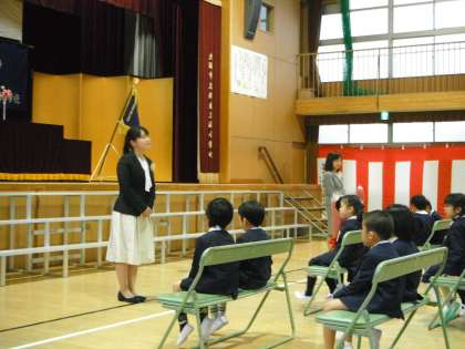 本日は、あいにくの雨天であったにも関わらず、晴天のように笑顔が素敵な1年生たち(49名)が入学式を迎えました。最初は緊張した面持ちで、講堂にちょこんと座って先生たちのお話を聞いていた1年生でしたが、2年生のお兄さんやお姉さんたちから歓迎の演技やお歌を披露されると、本当に嬉しそうにしていました。保護者や地域の方々、教職員の祝福に包まれて最高のスタートをきったことと思います。さあ、これからいっぱい勉強するとともに、大きな夢を持てる小学生となってください!