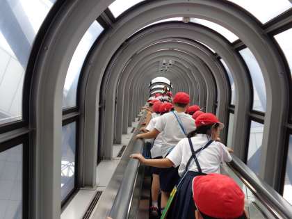 3年生の社会見学では環状線に乗って、大阪市内の様子を観察しました。電車の遅れもあって、みんなは、やや疲れていましたが、ハルカスや京セラドームなどを発見するたびに新鮮な喜びに満たされていました。大阪駅で下車をして、スカイビルの空中庭園などの見学もしましたが、その高さにはビックリ!眼下に見える建物がミニチュアの模型のようで、感動が大きかったようです。こんな感動や思い出を大人になっても持ち続けてほしいと願います。