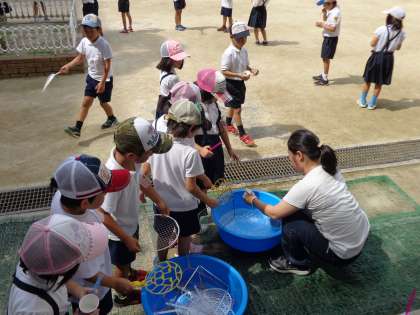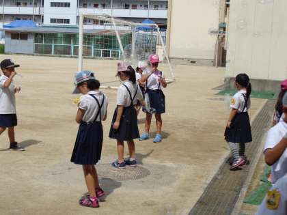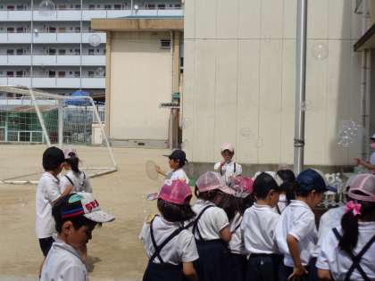 1年生では、ストローだけでなく、うちわやハンガー等を使って、様々な形や大きさのシャボン玉づくりを行いました。すべてが実験として子ども達には受け入れられ、大きなシャボン玉ができれば、とても嬉しそうにしていました。子ども達にとっては、とても楽しい“科学の学習”だったようです。