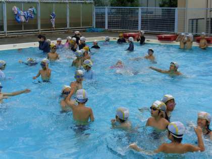 今日は3年生と4年生が合同でプール水泳に取り組みました。普段より多い人数で、全員が楽しそうに水泳を楽しみました。授業の後半には、全員が25メートル水泳に挑戦をしましたが、最後まで足をつかずに泳ぎきれた子どもはタイムをとってもらって、ますますやる気を出していましたが、まだ、泳ぎきれない子どもも「いつか25メートルを泳ぎきるぞ!」という気持ちになったことと思います。