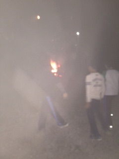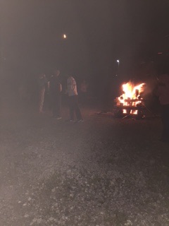 キャンプファイヤーの様子です。静かな暗闇の中で炎を囲んで、子どもたちの歓声や楽しそうな笑い声が響き渡っていました。
