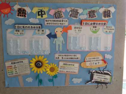 明日からはお盆が始まりますが、本日、いきいきの子ども達が下校したあとの校内はガランとしています。改めて、校内の掲示物を眺めてみると、地域の方が作ってくださった『くまモン』も、担当の先生方による掲示物も、すべてが優しさで溢れています。この夏休み中にも、みんなが安全で有意義な生活をおくることを祈ってくれているようです。