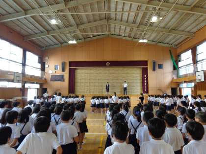 いよいよ始業式の日を迎え、2学期がスタートしました。子ども達は、とても元気で明るく、良い夏休みを過ごしたことがうかがえました。始業式では、転入してきた児童や、新しく着任された先生の紹介などもありましたが、子ども達は素晴らしい表情で拍手してくれました。