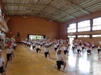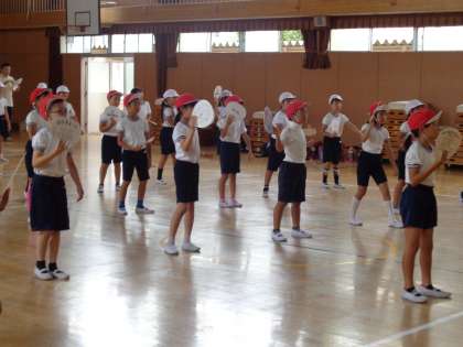 学校内も運動会(10月2日(日))モードになってきました。3・4年は今日、初めての団体演技の練習に取り組みました。全員がうちわを持って、勇ましい踊りです。指導する先生方も子ども達も汗びっしょりになるまでがんばっていました。運動会本番で、どのような演技をお見せできるか、こうご期待です!