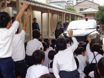 4年生では、淀川警察署の方を講師にお招きし、防犯訓練を行いました。犯罪に巻き込まれないための様々な重要なことを教えていただきました。また、警察手帳や手錠等を見せていただき、覆面パトカーに乗せていただくなど、警察の方々のお仕事を身近に感じながら学習することができました。