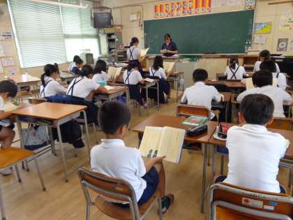 子どもの特性や習熟の様子に応じて、少人数で丁寧に教える授業のスタイルを、少人数習熟度別授業と言いますが、本校では熱心に取り組んでいるものです。このことによって、すべての子どもが授業がわかり、楽しくなることをねらいとしています。本日は5年生の国語で2クラスの児童を3つのグループに分けて少人数習熟度別授業を実施している様子をご覧いただきます。みんな、授業にとても一生懸命取り組んでいます。