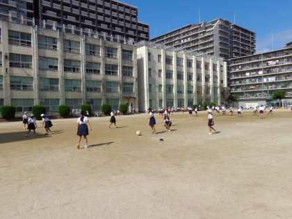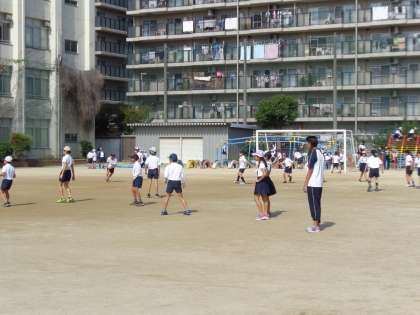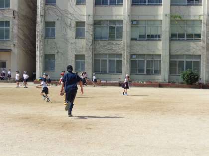 2時間目の後、15分休憩の様子です。1〜5年生も、みんな元気です。外でボール遊び、鬼ごっこをしています。教育実習生や職場体験の中学生も外で一緒に休み時間を過ごしています。