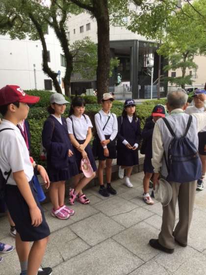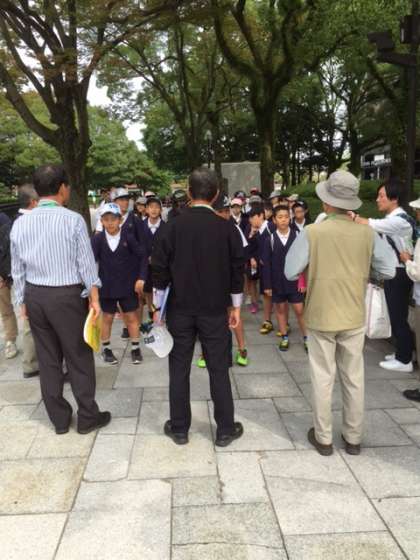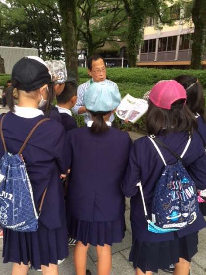 碑めぐりが始まりました。原爆ドーム近辺にある碑を、ボランティアの説明を聞きながら巡っています。