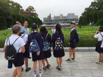 ボランティアの方の説明を聞きながら、平和公園を見学しています。