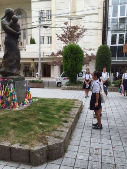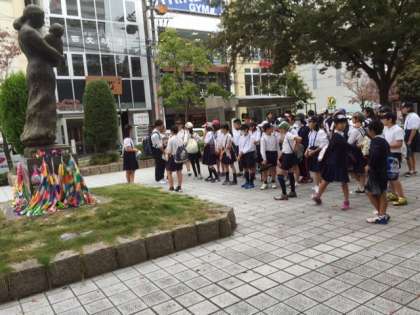 慰霊碑前にて、平和を願うセレモニーを行いました。代表児童が「平和の誓い」を述べた後、全校生徒で折った折り鶴を捧げました。