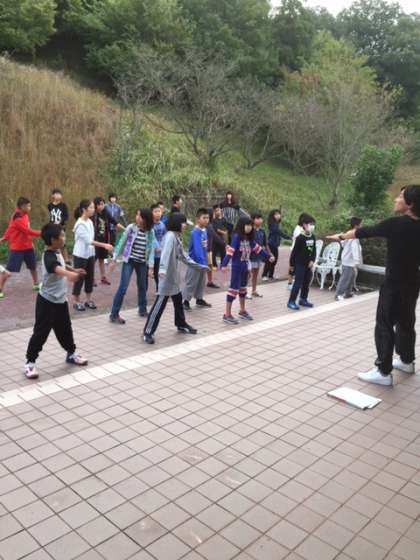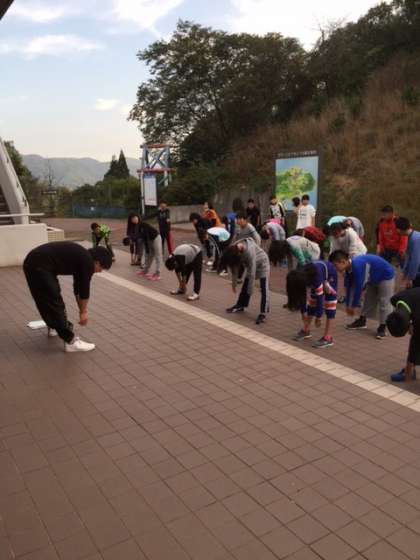 朝の集いで体操をしています。とても気持ちのいい朝です。早いもので、今日大阪に帰ります。それまで、たくさん楽しんで、思い出を作りましょう。