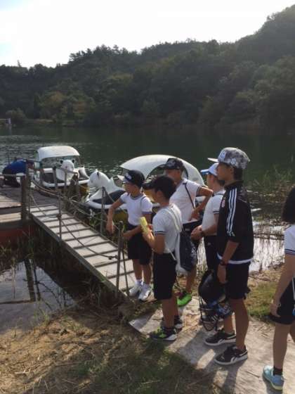 小さい新幹線。無邪気です。湖畔にたたずむ子供たち。