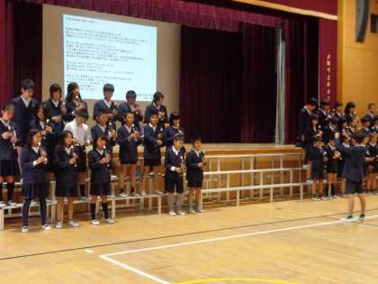 6年生の学習発表は、広島への修学旅行で実際に学び、感じてきた平和についてのアピールになっています。人の命の大切さ、人の命を守る平和の貴重さを、心を込めた群読やアルトリコーダーなどでうったえます。その場で6年生の発表を見られた方は必ずジーンとくることは間違いありません。