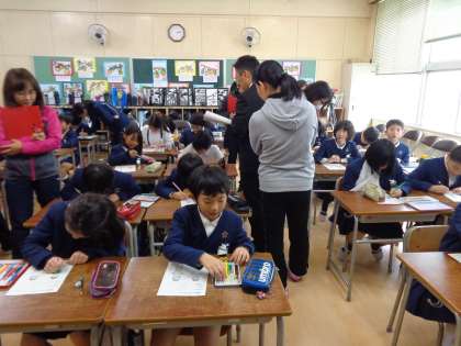 本日の5時間目に、4年で英語の研究授業がありました。英語で「あなたの好きな色は何ですか?」に対して答えたり、英語を駆使してお気に入りの洋服を絵に描きながらコーディネイトしたり、レベルも高いものでした。だけど、子ども達は全員が楽しく取り組んでいました。ますます、英語が大好きな子どもが増えることを期待しています。