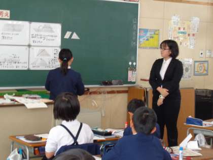 5年で算数の研究授業を行いました。ひし形の面積を求める問題などに取り組みましたが、実際に机上で図形を描いたり、切ったり、いろんな角度からアプローチしています。そして、お互いの答えとそのプロセスを確認し合ったり、とても有意義な授業でした。