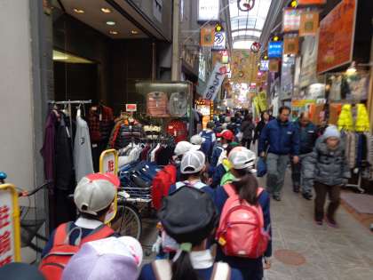 12月9日(金)、1・2時間目を終えて、3年生は天満にある「大阪くらしの今昔館」へ行き、社会科の学習に行ってきました。扇町公園で、お家の人の心のこもったお弁当を食べました。少し、時間もあったので、遊具で遊びました。すべり台ではしゃぎまくりました。さあ、これから、日本一長い天神橋筋商店街を通り、今昔館へ向かいます。