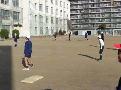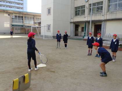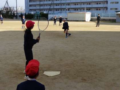 5年生が行っている競技はラケットベースボールといって、真剣な球技です。バットの替わりにラケットを持ってボールを打ちます。あまり野球やソフトボールをしていない子どもでも比較的、打ちやすくて誰でも楽しめます。子どもは、何でも新しい競技を作りだせるようです。