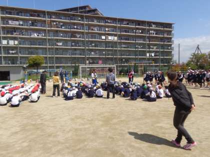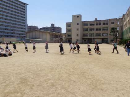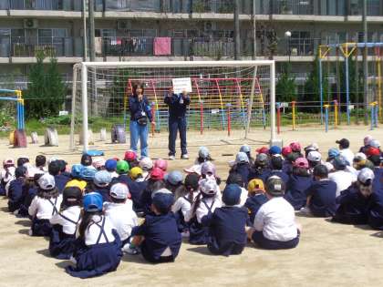 本日10時20分より、全校一斉の避難訓練を行いました。今回は火災発生を想定して、煙に気を付けながら、頭を低くしてハンカチで口を押えながら、素早く指示を聞いて、運動場に避難するというものでした。淀川区セーフティネットの方にも来ていただき、火事による避難のこと以外にも不審者について等、安全管理の上で大切なことをたくさん学ばせて頂きました。