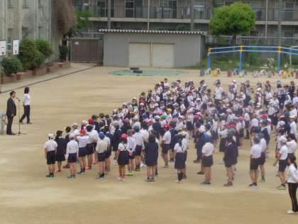 本日の児童朝会では、5月5日に淀川区交流こどもキックベースボール大会で準優勝した新東三国連合こども会の子ども達が表彰を受けました。キレイなトロフィーも贈られましたが、これらは普段の練習の賜物(たまもの)です。これからもがんばってください!